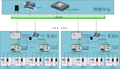 门禁系统分为三级架构。控制中心的中央级服务器、车站级的门禁控制主机、就地级的门禁控制模块。门禁控制主机以网络的形式和中央级服务器连通,就地级门禁控制模块采用双总线的形式连接,系统的架构合理、组网灵活、稳定性高。门禁系统所有设备均属于自主研发,主控制模块的协议是不开放的,不会被外界攻击。读卡器等下层设备都经过严格的加密算法加密,避免了采用监听的方式窃取系统信息。门禁控制主机有超大的存储容量,从中央级服务器获取数据,独立备份存储于控制器中,每个车站的门禁系统在服务器断开的情况下,均可独立运行。